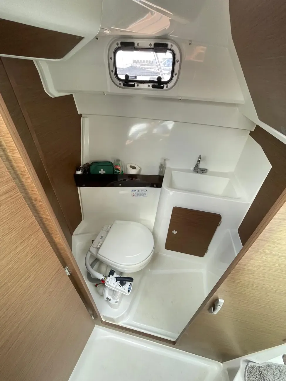 – Heads located to Starboard side fitted with a sea toilet, storage and a sink
